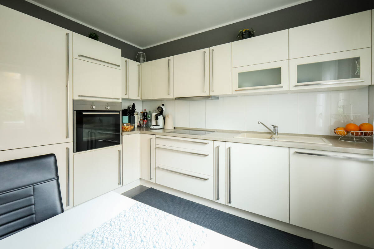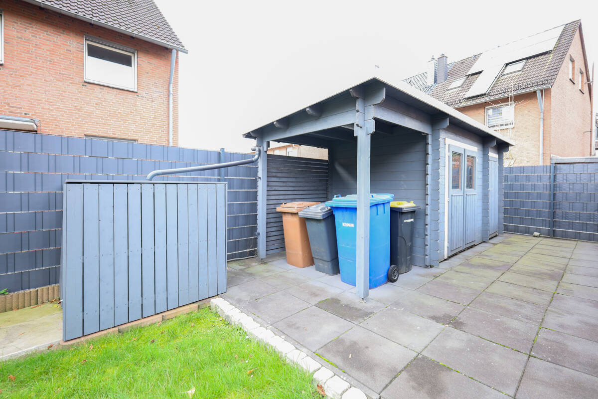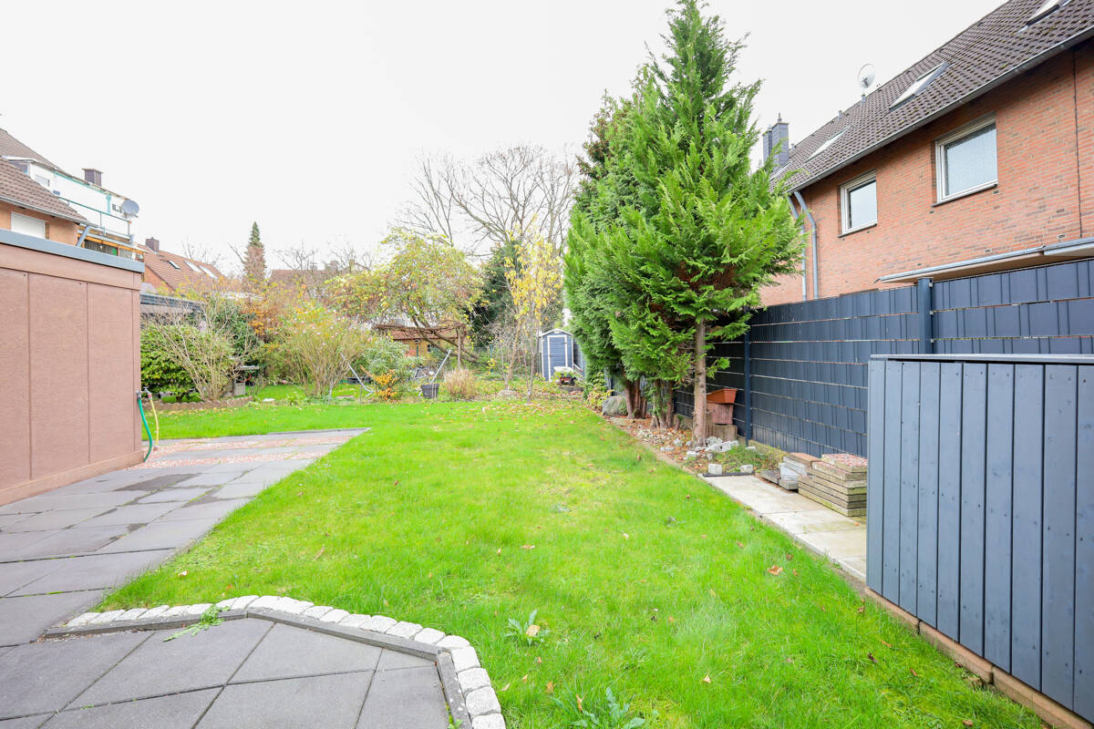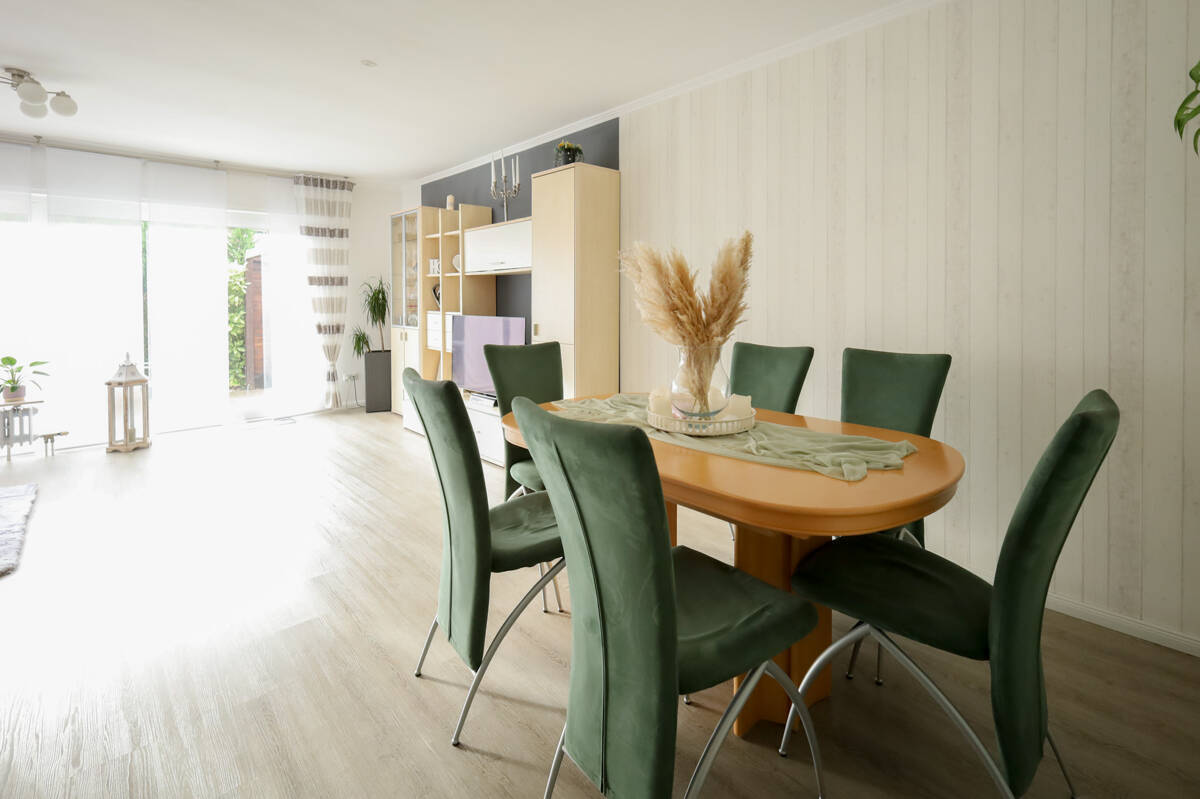 Im Erdgeschoss erwarten Sie ein Gäste-WC, eine Küche, die sowohl über die Diele mit praktischem Abstellraum als auch direkt über den Essbereich zugänglich ist. Der helle Wohn- und Essbereich überzeugt mit einer großen Schiebetüranlage zur Terrasse und in den Garten.