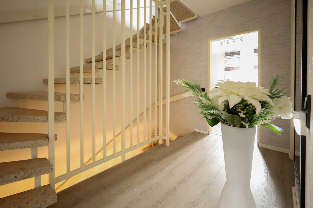 Eine stabile Steintreppe mit weiß lackiertem Metallgeländer führt Sie in das erste und zweite Obergeschoss.